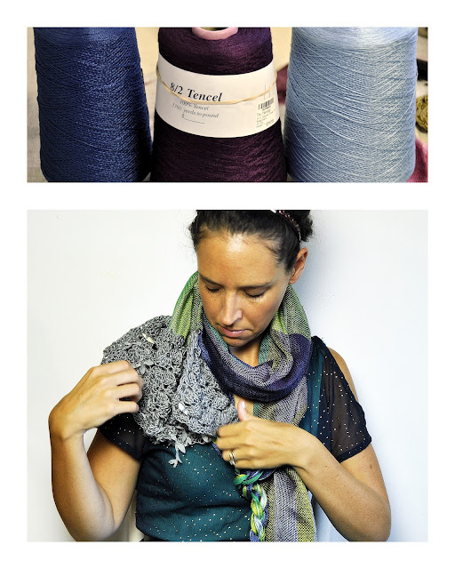 Kelly Ann was the first scarf that I started to work on. I don't think that I can even express how much fun I had making her. To give you a hint, I got up at 5:30 am on my day off so that I could get into the studio!! I loved how the colors were working together, and was thrilled to use some of the new funky yarn that I picked up at The Mannings a few weeks ago.